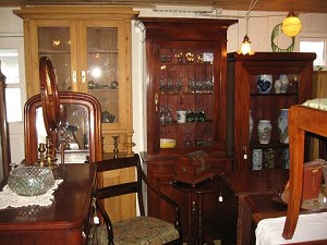 Stor salgsudstilling med restaurerede møbler håndpolerede mahognimøbler, afsyrede fyrretræsmøbler, malede træmøbler, kun originale gamle og antikke møbler.