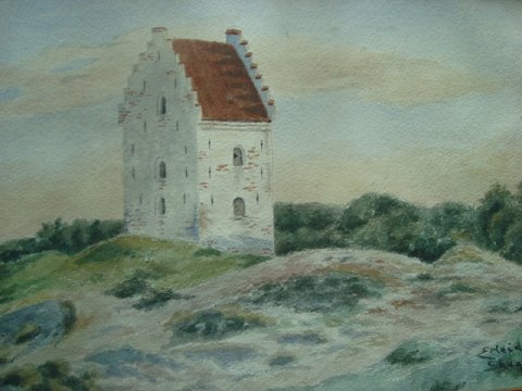 Bagpå: Fru Ella Heide "Den Tilsandede Kirke" "Aquarell 1948"