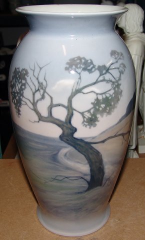 Bing og Grøndahl Art Nouveau Vase No. 8592/370. Motiv med landskab og kroget træ. Måler 25 cm / 9,84 in. og er i god stand.