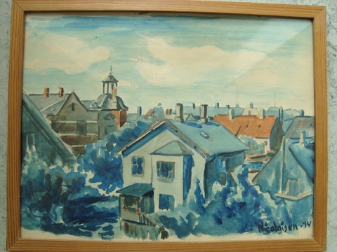 Akvarel af Oscar Nicolaisen 1944 - Vue ud over by.