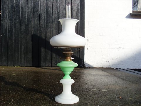 Petroliumslamp i opalineglas med smuk tyrkisgrøn olie beholder.