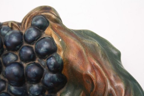 P. Ipsens Enke, fad med druer god stand, dog er der 2 bitte små chips, se ekstra foto. Højde 6 cm. Diameter 30 cm. Pris: 475 kr.