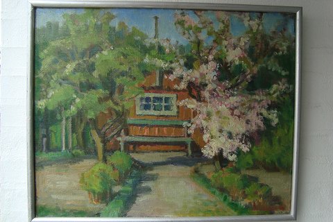 Haveparti med hus, bænk og blomstrende frugttræer 1949.