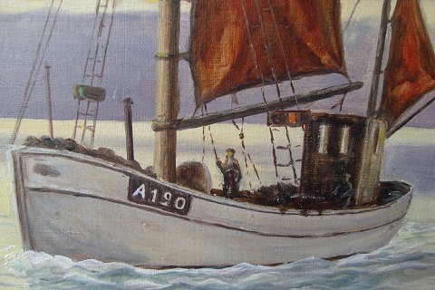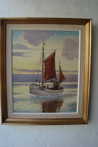 Maleri af Gotfred R. 1966 - Fiskekutter ved solopgang.