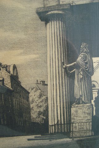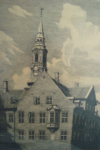 Radering af J. Dragsbo - Indgangsparti til Vor Frue Kirke i København samt Bispegården.