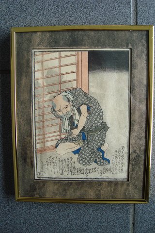 Japansk koloreret træsnit - Erotisk scene med ældre mand.