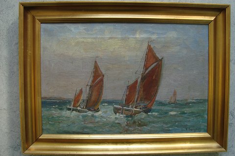 Maleri - Sejlskibe på åbent hav. - sign.: V. Bang.C.