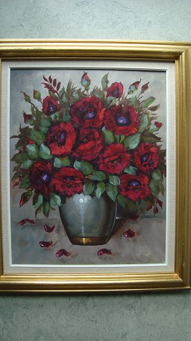 Maleri af Harriet Hansen - Røde roser i vase.