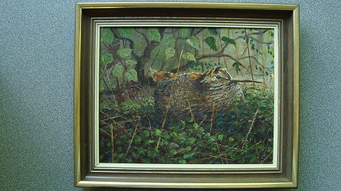 Maleri af ubekendt kunstner - Skovsneppe på rede.