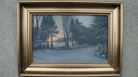 Maleri af Hans Agersnap - Solen går ned bag vinterklædt skov.