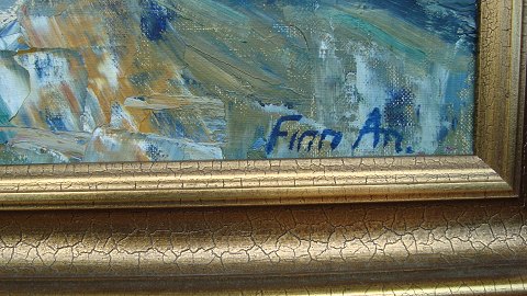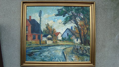 maleri af Finn Andersen - Landsby med iskiosk og vejskilt.