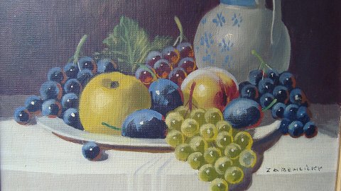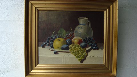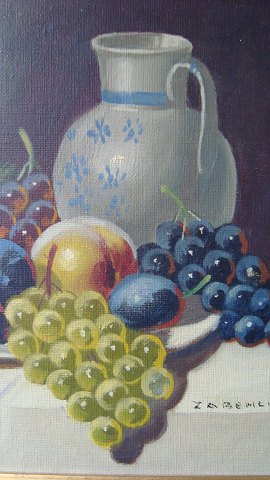 Maleri - opstilling på bord med frugtfad og rhinsk vinkande.