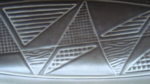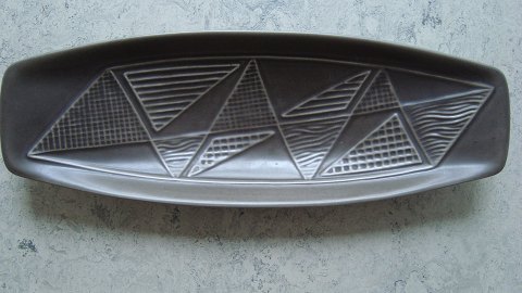 Aflangt bordfad med mokkafarvet glasur og kubistisk reliefdekoration.