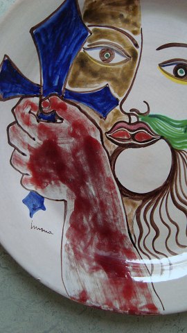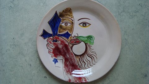 Spændende, stort, signeret bordfad/vægplakette med surealistisk dekoration.