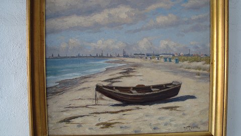 Parti fra Sønderstrand, Skagen med badehuse og båd.