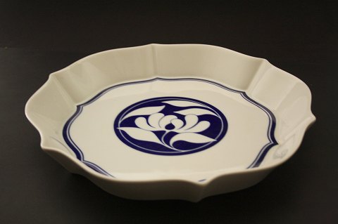 Bing & Grøndahl, stort flot hvidt porcelænsfad med en blå blomst i midten af fadet. Dek.nr. 7558-262. Formgivet af Bo Bonfils. Dekoreret af Anne-Grethe Halling-Koch. Diameter 32 cm. Højde 5,5 cm. I. sortering og perfekt stand. Pris: 675 kr.