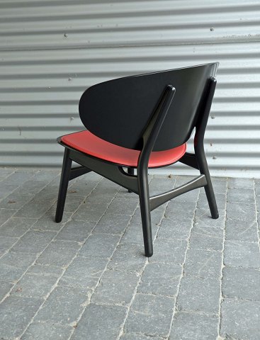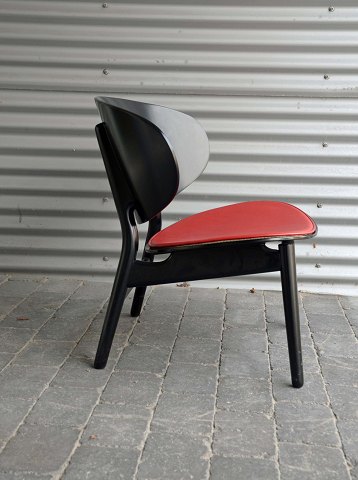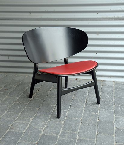 Flot lav skalstol FH1936, design af Hans Jørgen Wegner. Stolen fremstår nyrestaureret og den røde hynde medfølger. Højde: 70 cm. Bredde: 58 cm. Dybde: 48 cm. Sædehøjde: 37 cm.