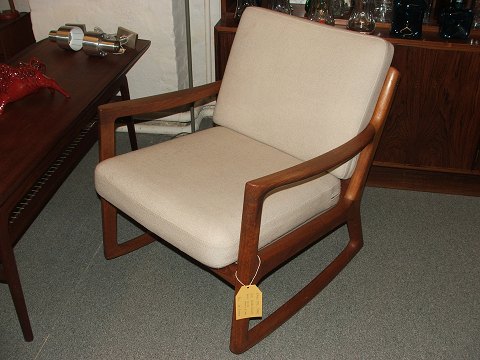 Komfortabel gyngestol i teak designet af Ole Wanscher model FD 110 - France og Søn. Stolen har lyse stofhynder og fremstår flot uden pletter og skrammer.