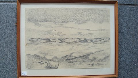Bly tegning signeret TZ - Kystparti med flyvende måger.
