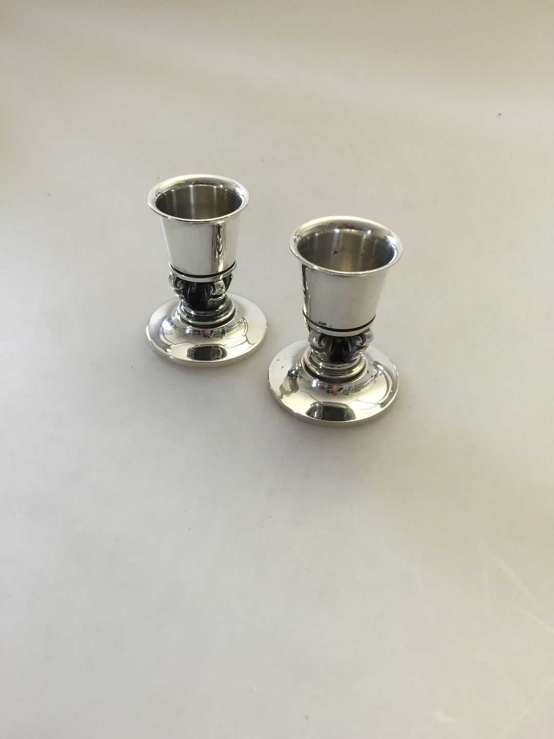 Georg Jensen Sterling Silver Acorn Candlesticks No 741. Measures 5,3cm and is in good condition.