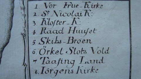 Stedsbetegnelser: 1. Vor Frue Kirke - 2. St. Nicolai Kirke - 3. Kloster Kirke - 4. Raad Huuset - 5. Skibs-Broen - 6. Örkel Slots Vold - 7. Taasing Land - 8. Iörgens Kirke.