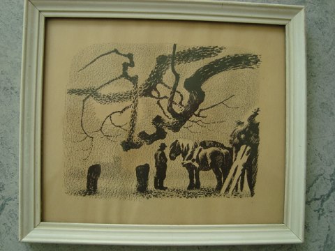Litografisk tryk af Sikker Hansen - landmand og heste ved høstak.