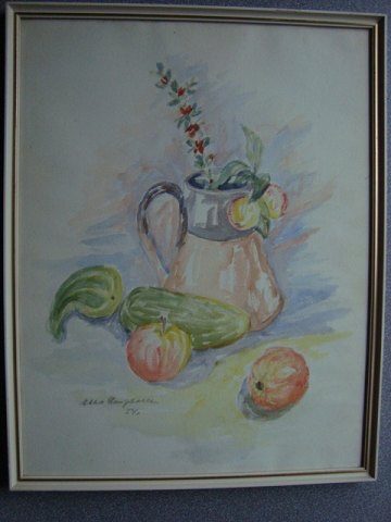 Akvarel af Ebba Langballe 1954 - Opstilling med kande, frugt og græskar.