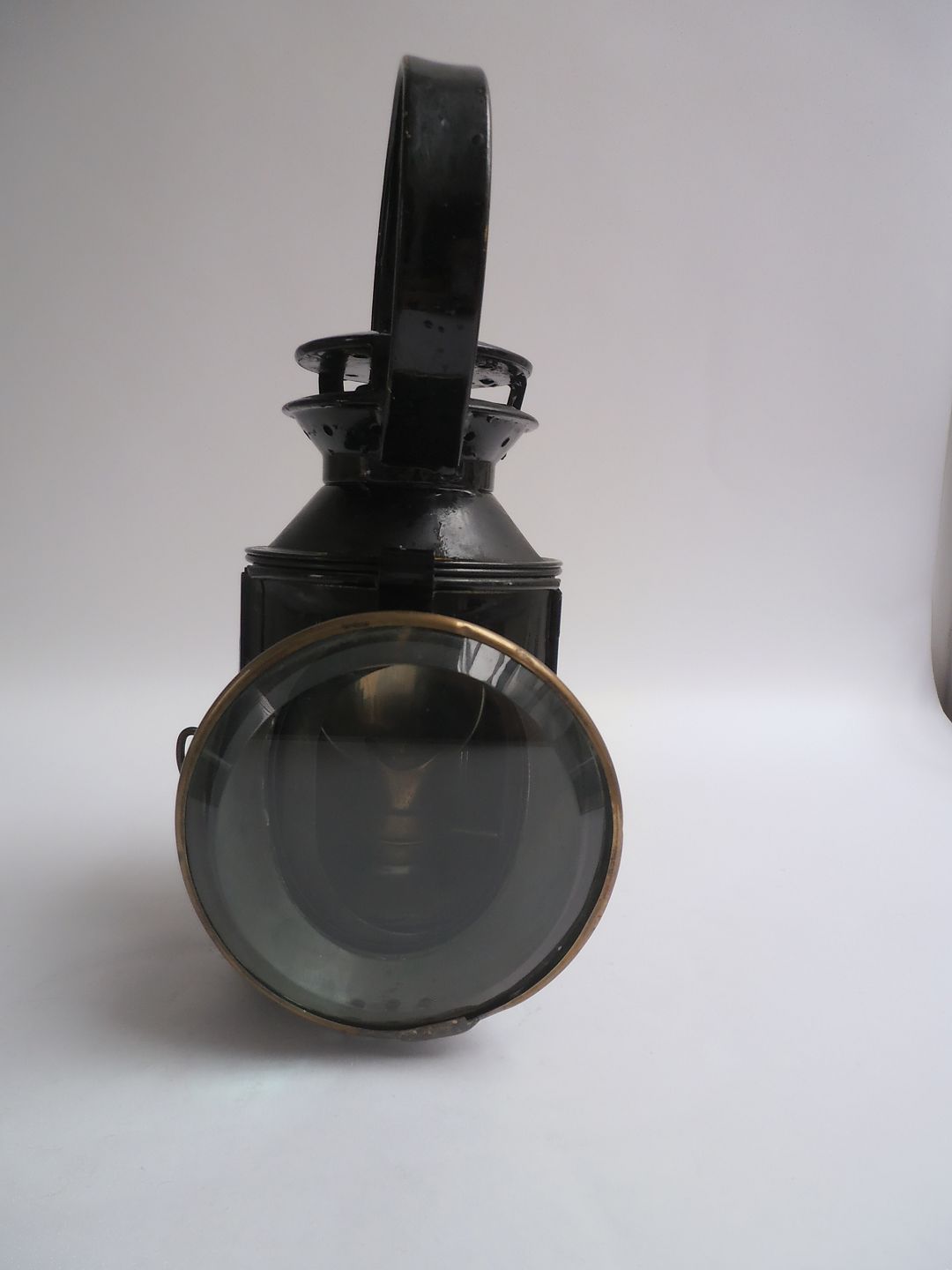 Sortmalet tog lygte m. slidt guldkant, original petrolemusbrænder m. rød/grønt/orange glas, Danmark ca. 1880.