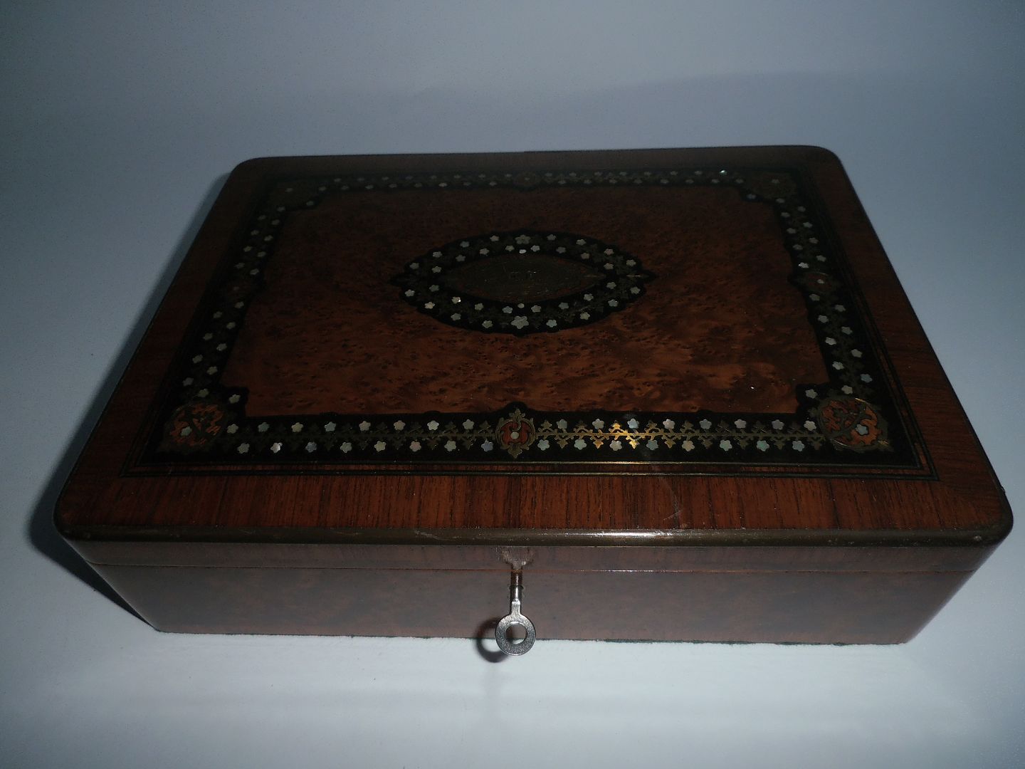 Kortæske af mahogni m. indlægninger af guld og perlemor i låg, fyldt med chatonner , England ca. 1880.