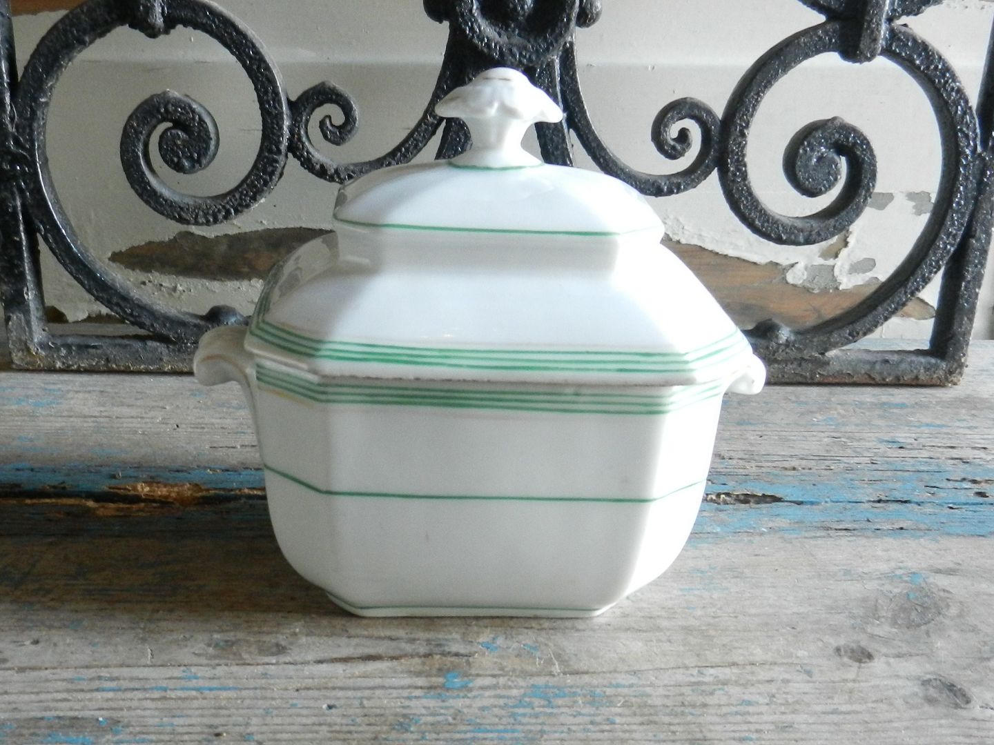 Fransk 1800tals sukker skrin, dekoreret i grøn og guld.
