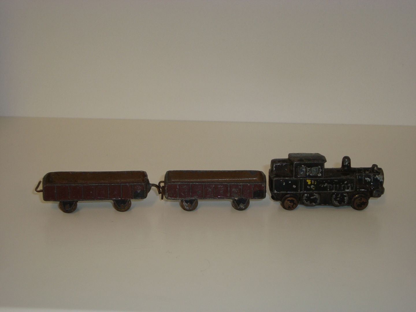 Gammel legetøjstog i støbt metal, lokomotiv og to vogne mærket Pilot, højde 2,5 cm, længde 18 cm, alm. brugsslidtage.