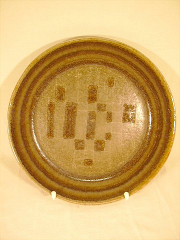 Stilren Carl Harry Stålhane fad af stentøj, dekoreret med brunlige harepelsglasur. Ø: 28 cm. H: 5,5 cm. Sign. CHS. 2.sort