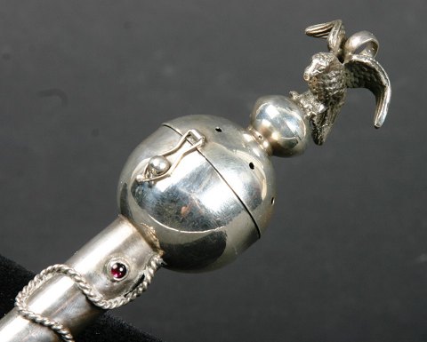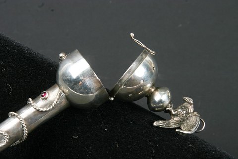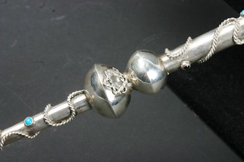Russisk pegepind/tora pointer af sølv, prydet med røde og blå flus, samt fugl hvorunder rum til at åbne, Davidsstjerne og bånd. Stemplet N.A, BC, m.fl. 1873. L. 38 cm