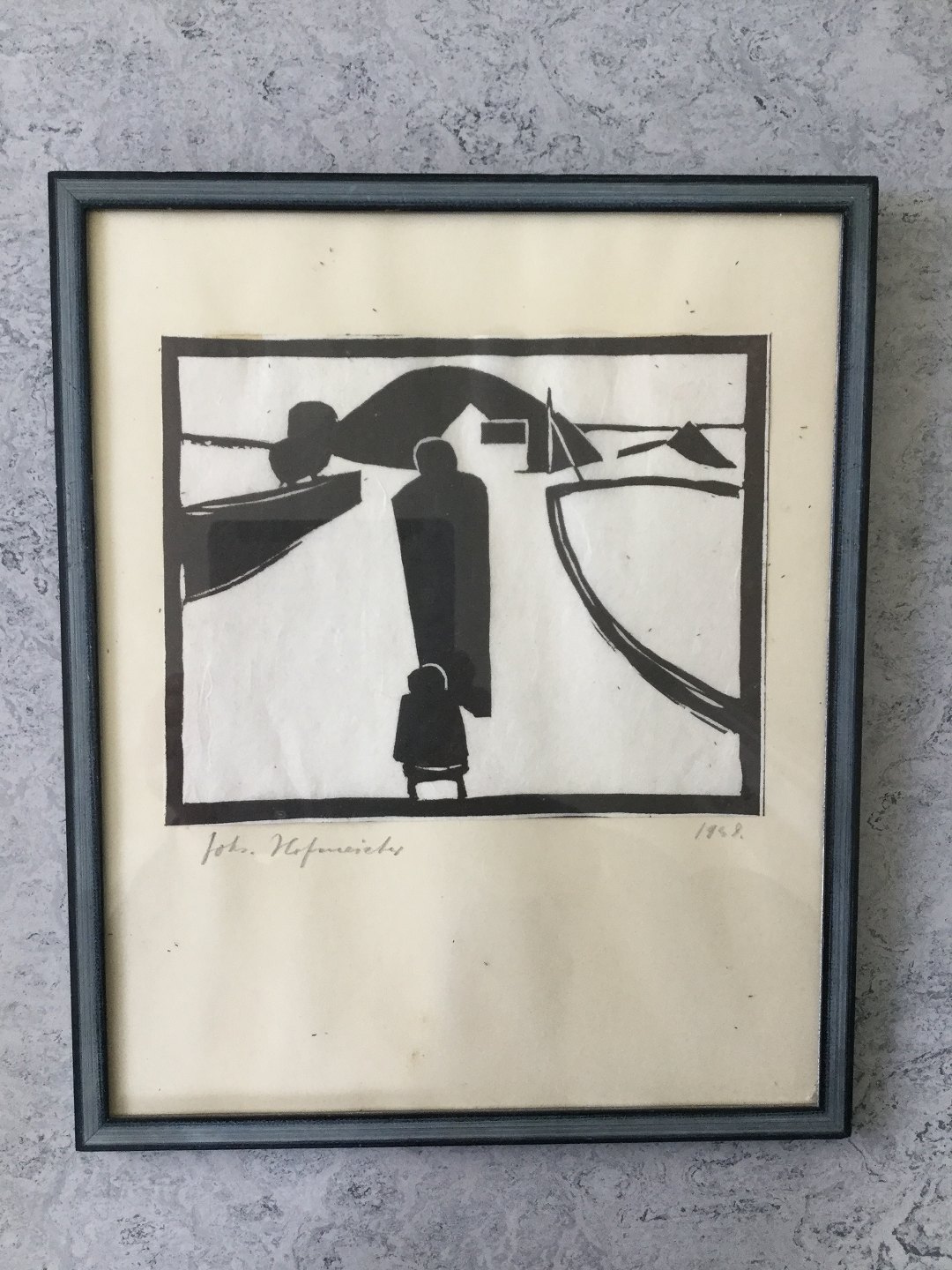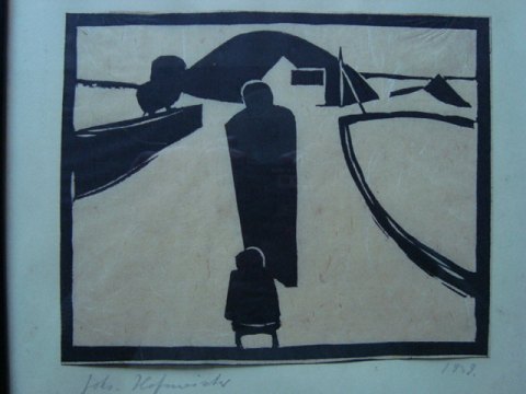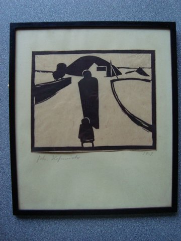 Linoleumssnit af Johannes Hofmeister - Person med kælk i landskab.