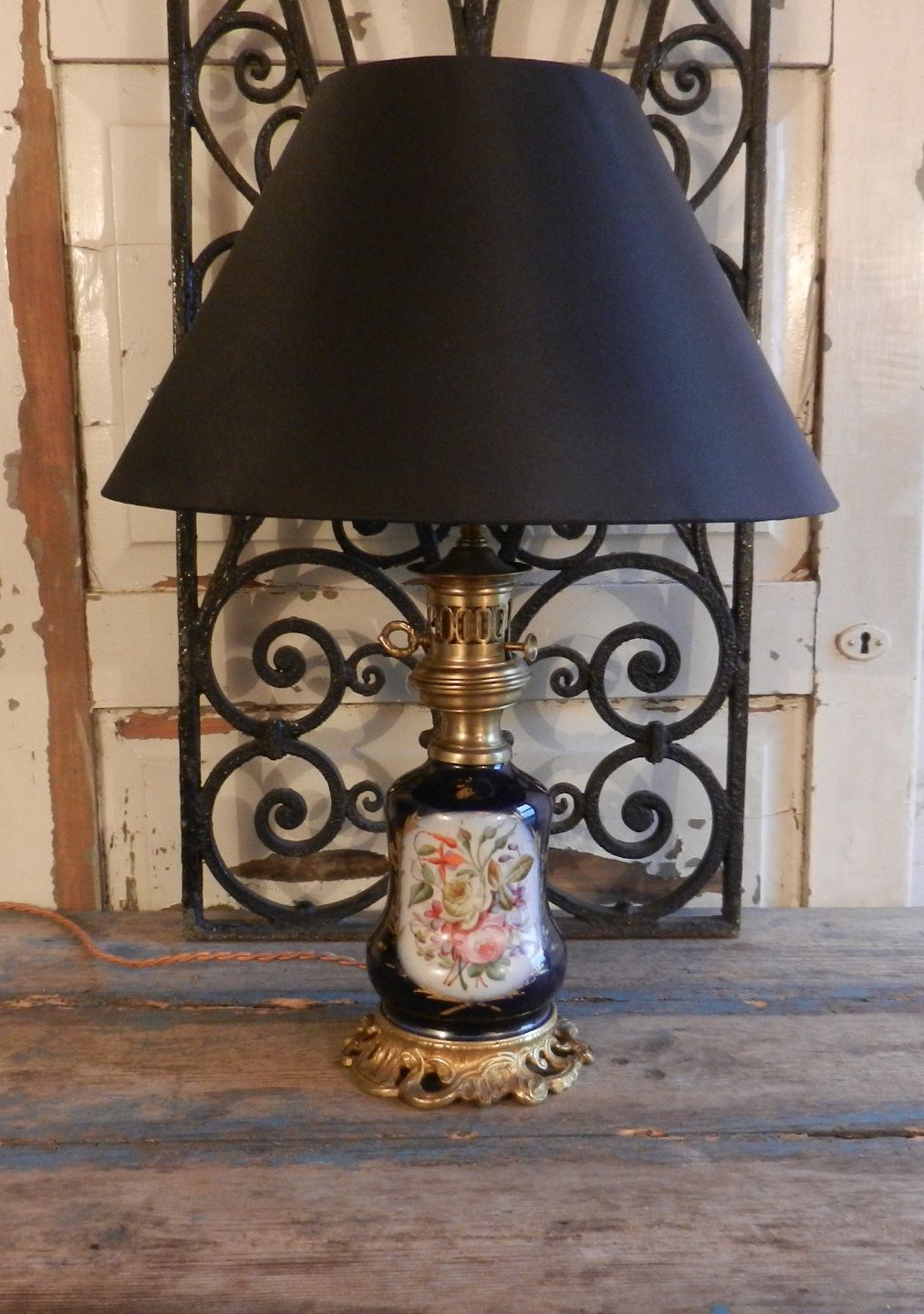 1800tals bordlampe af håndmalet porcelæn monteret på lue forgyldt bronze fod.