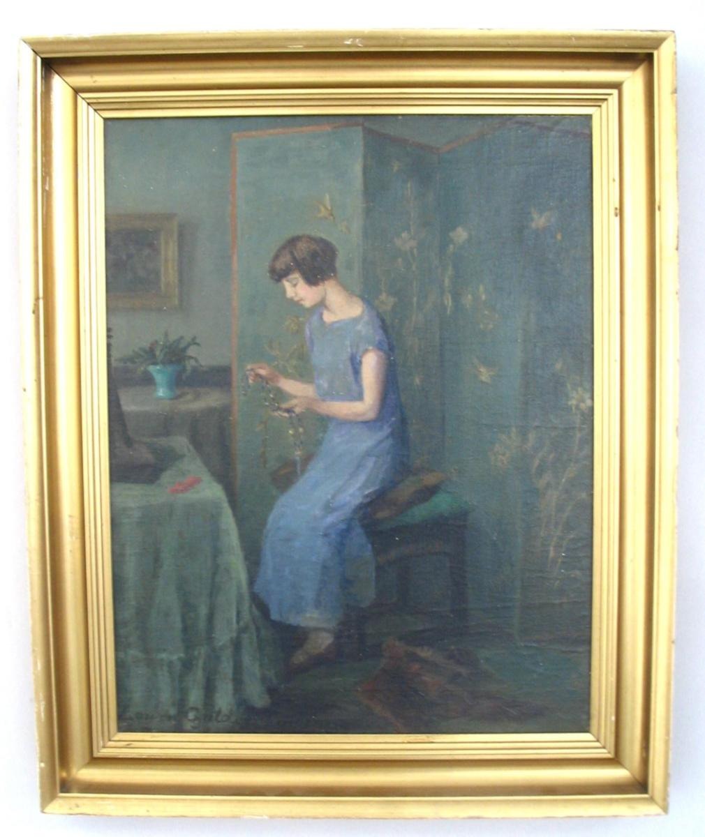 Laura Guldbrandsen (1866 -) Danmark: En ung kvinde prøver smykker foran spejlet. Olie på lærred. Sign.: Laura Guldbrandsen. 47 x 37 cm.