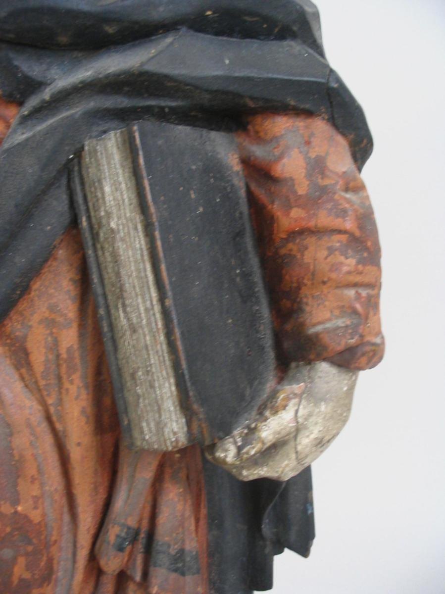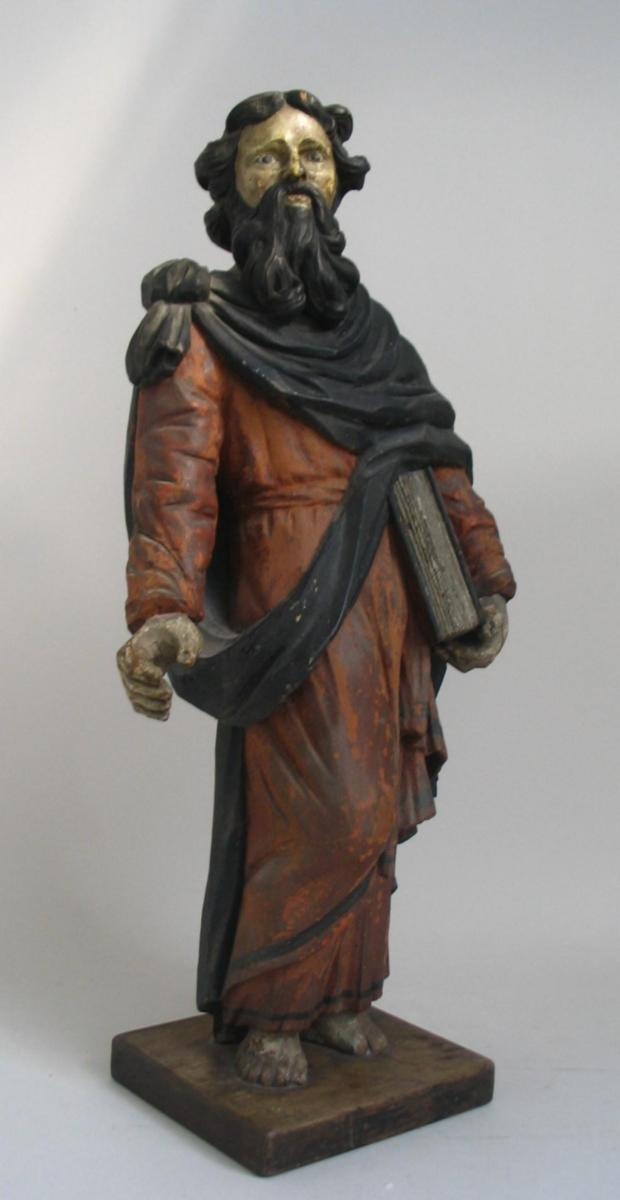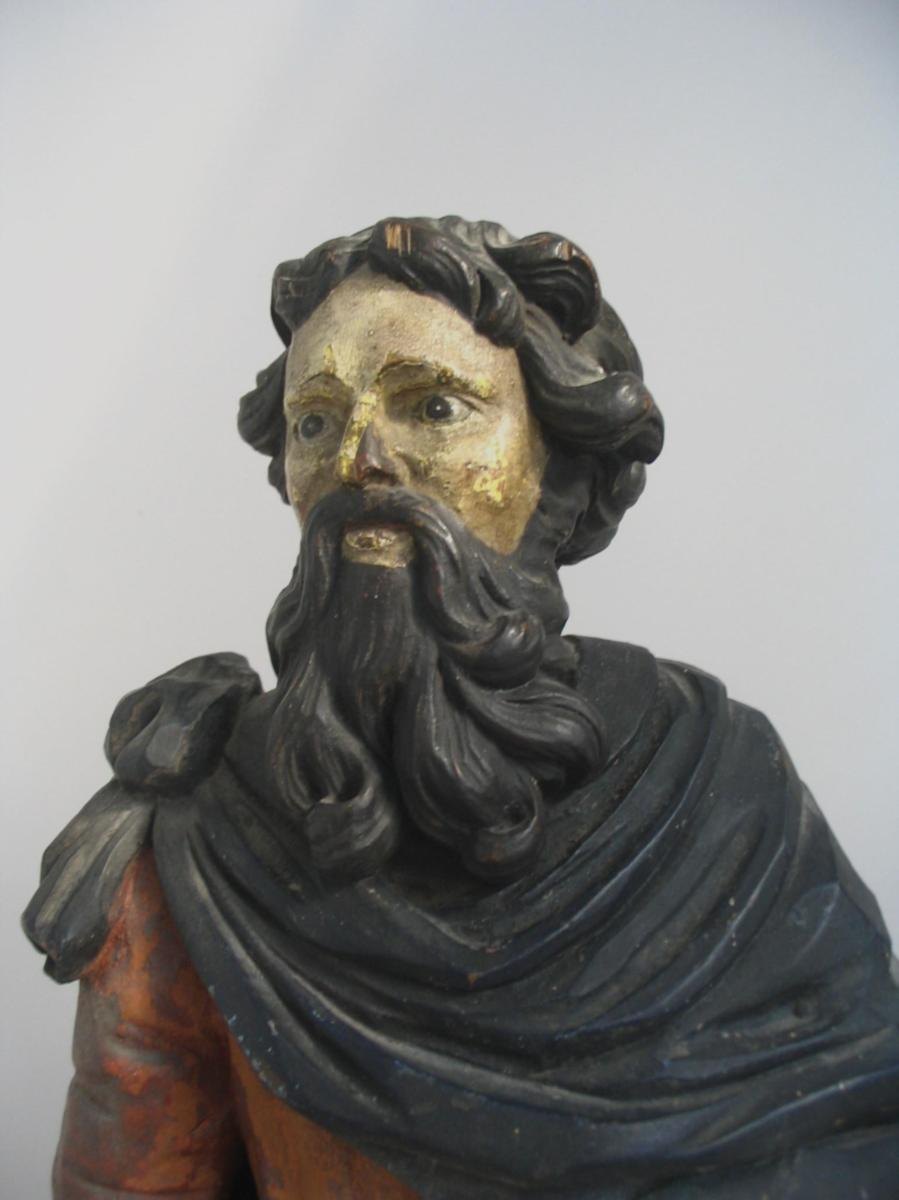 Træ skulptur, Moses med Mosebogen under armen, 17. årh. Sort, gul og rød bemalet. På monteret en sokkel i egetræ. H.: 56 cm. Proveniens.: Fyn. Flot stand!