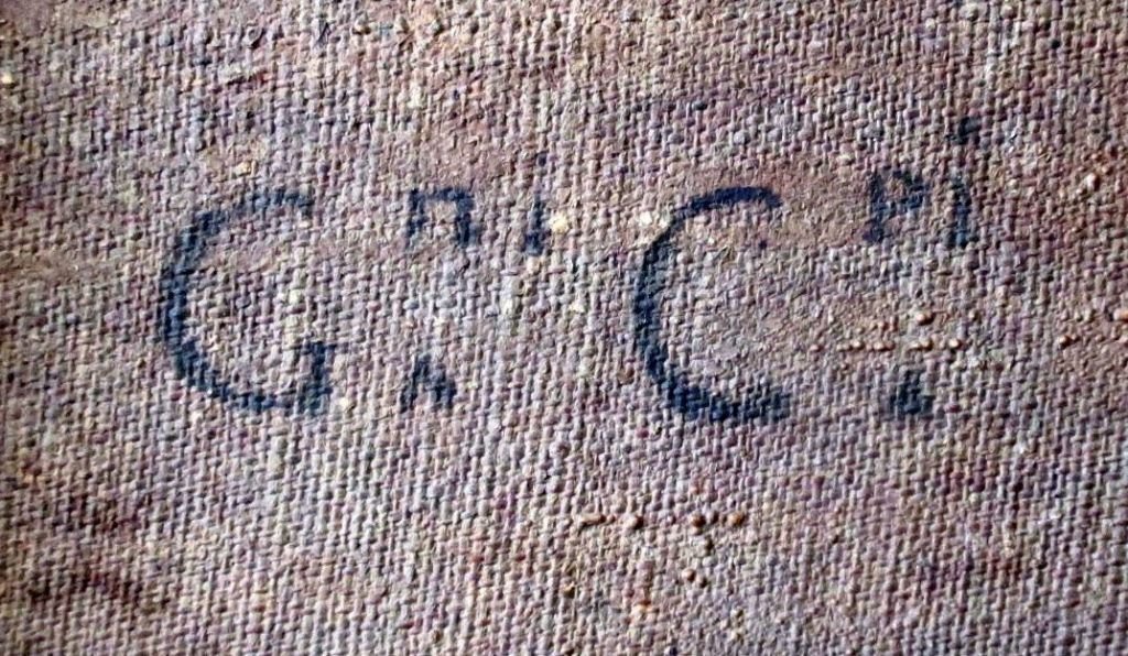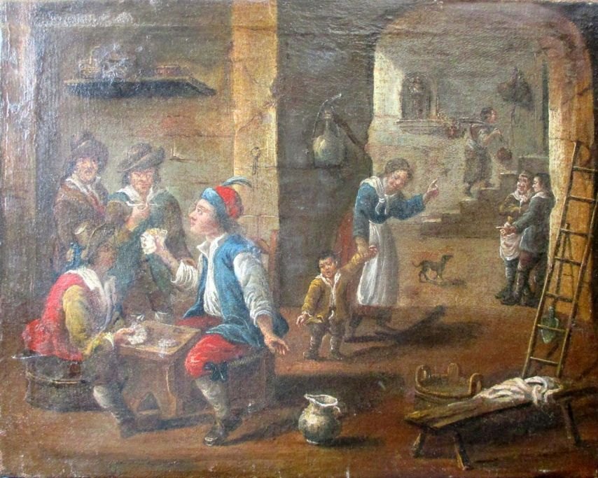 Hollandsk kunstner (18. årh.): Interiør fra en stenkælder med mange personer. Bl.a. kortspillende mænd, rygende, opdragende mor m.v. Olie på lærred. 36 x 46 cm. På lærredets bagside signeret: G ..a n i C .. pi. Repareret. Blændramme fra 19. årh. Uden ramme.