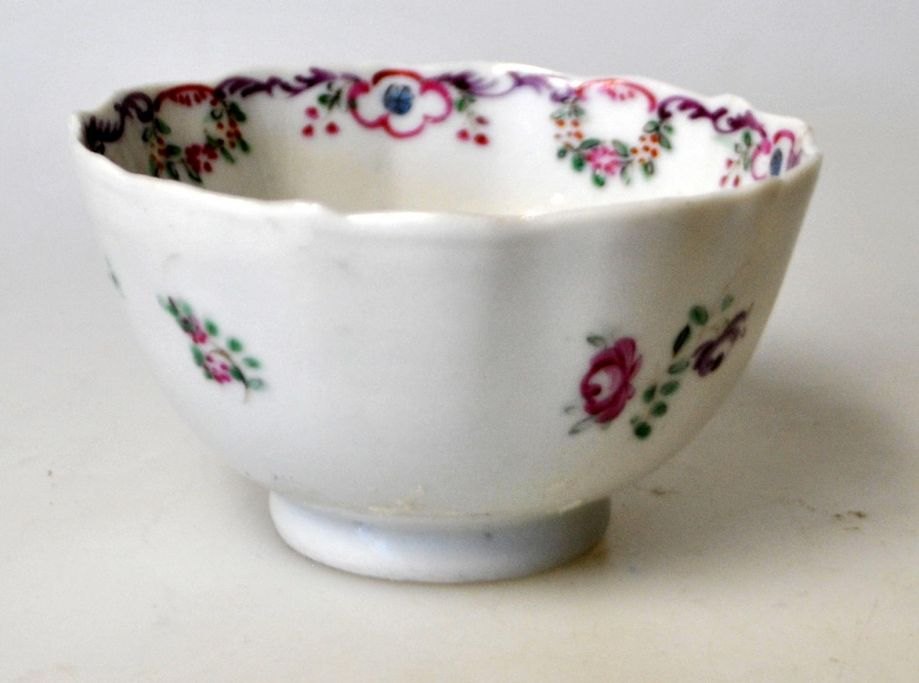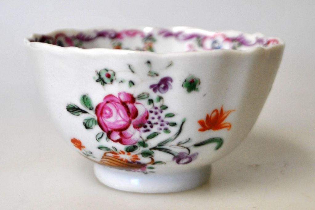 Small bowl, China, with wavy edge. Decorated with flowers in polycrome enamel colors. With wreath of flower ornaments. China Qianlong, ca.1780. H: 4.8 cm. Dia: 8 cm. With small cracks.