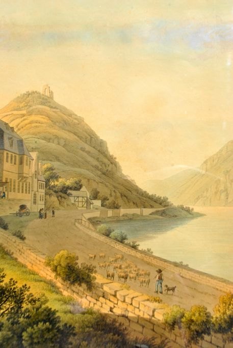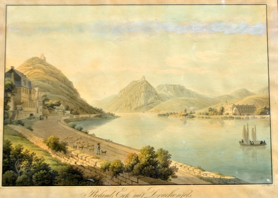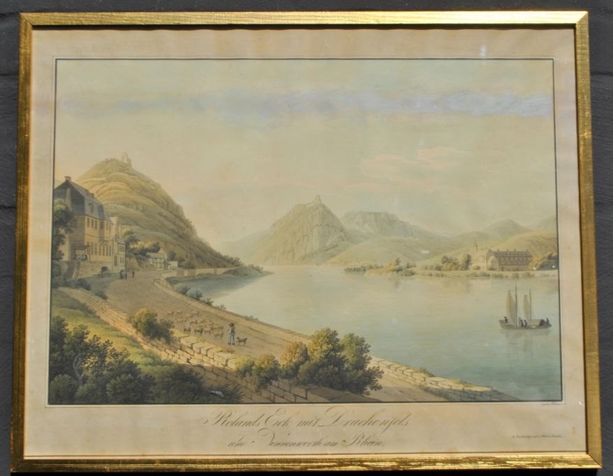 Håndkoloreret topografisk aquatinte af Carl Wizani (1767 - 1818), Tyskland, af Rolands Eck mit Drackenfels und Nonnenwerth am Rhein. Med trykramme. Signeret. Udgivet af Kunstverlag L. v. Kleist in Dresden. 35 x 50 cm. I nyere guldramme.