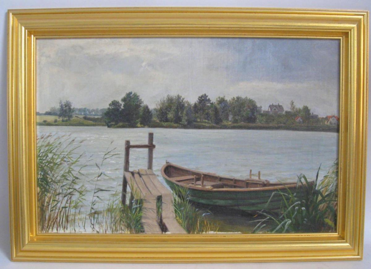 Hærning, August (1874 -) Denmark: A rowing boat on a lake - a summer day. Oil on canvas. Signed: B .: August Hærning. 35 x 53 cm.