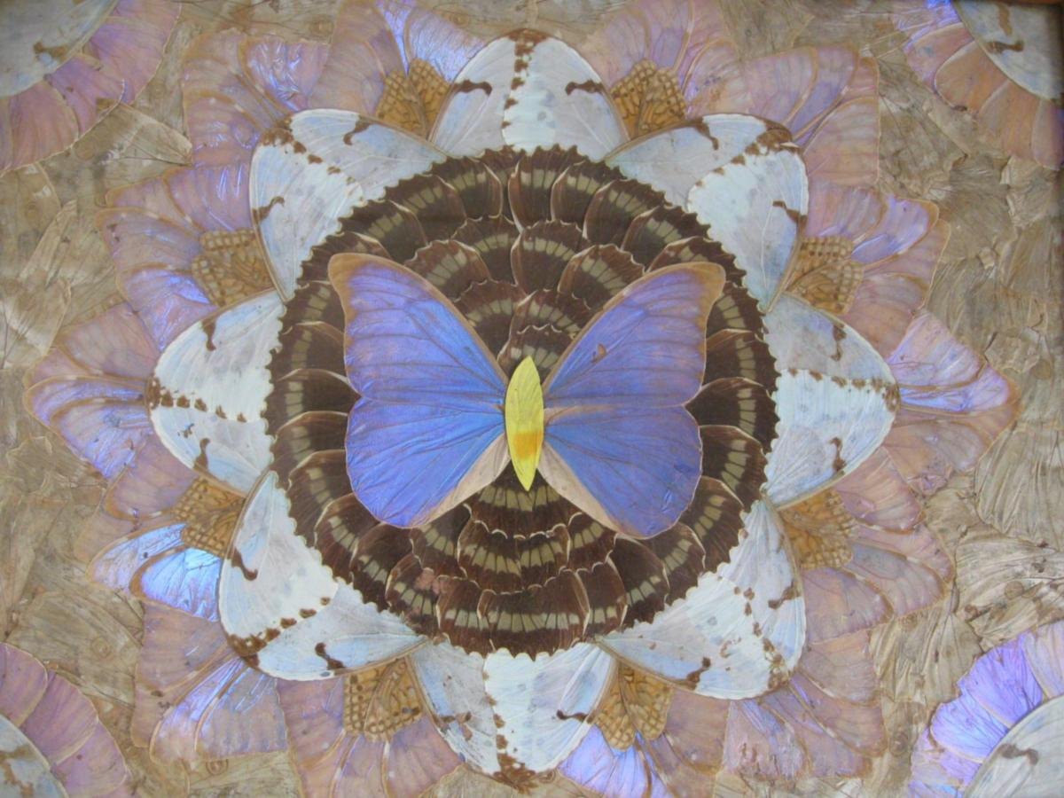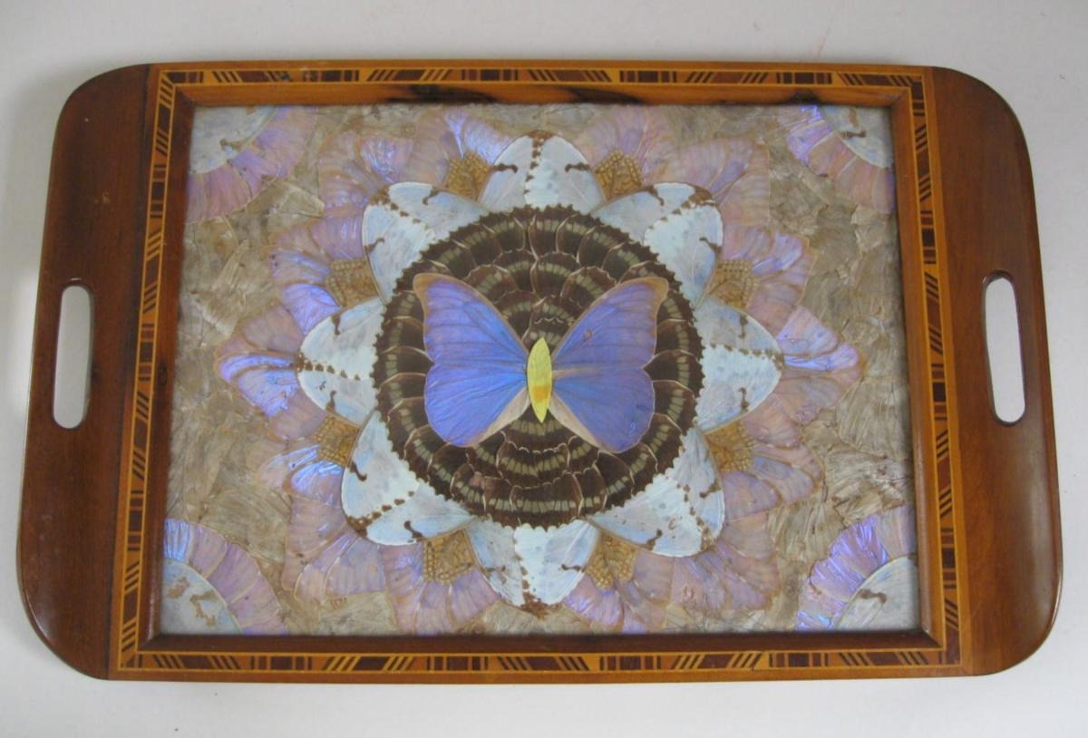 Bakke med intarsia, ca. 1920. Med glas og mønster med sommerfuglevinger. Sydamerika. Flot stand. 52 x 34 cm.