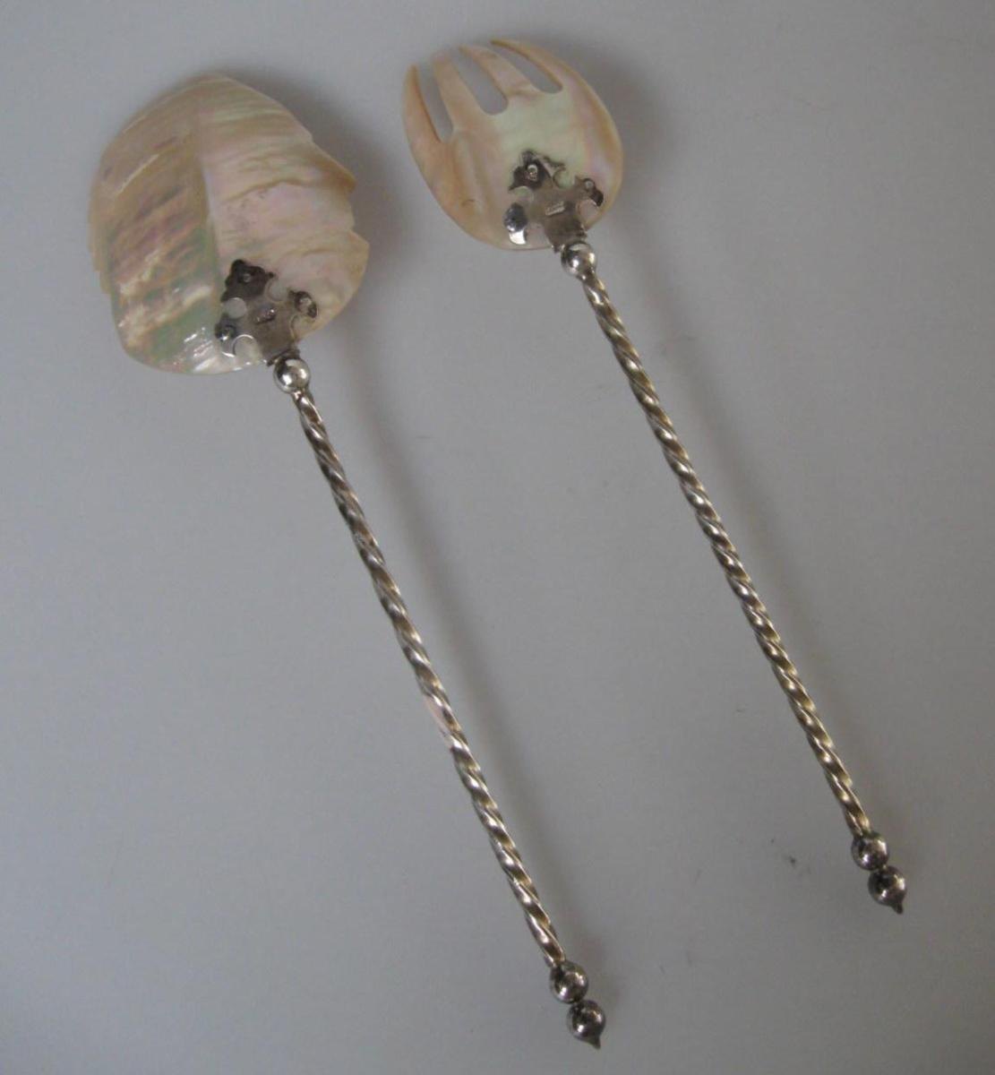 Tag tøj i sølv med perlemor, 19. årh. Med snoede skæfter. Perlemors skeen dekoreret med en indianer med fjerprydelse. Stemplet.: 830 S. L.: 24 cm. I æske