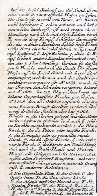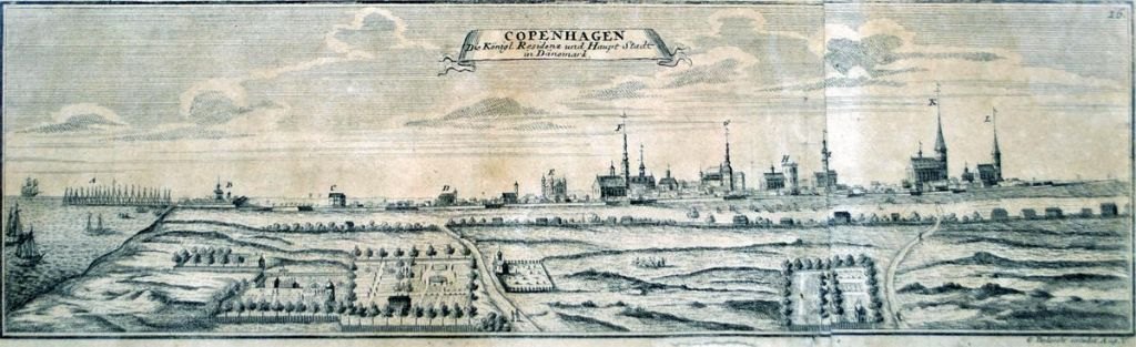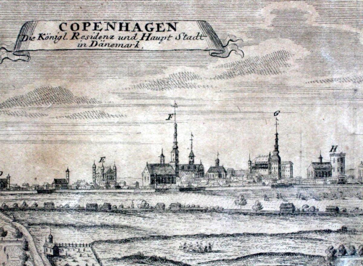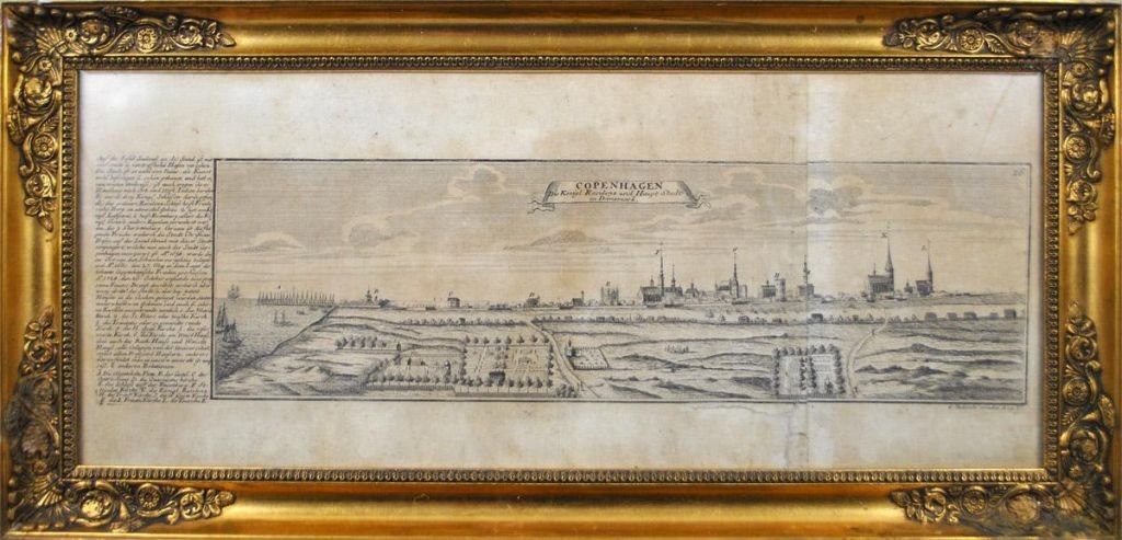 Kobberstik over København, 17. årh. "Die Königliche residenz und Haupt stadt in Dänemark!, Tysk. Udarbejdet af G. Bodenehr. 12 x 42,5 cm. Med tekst på tysk. Med senere dekoreret guldramme.