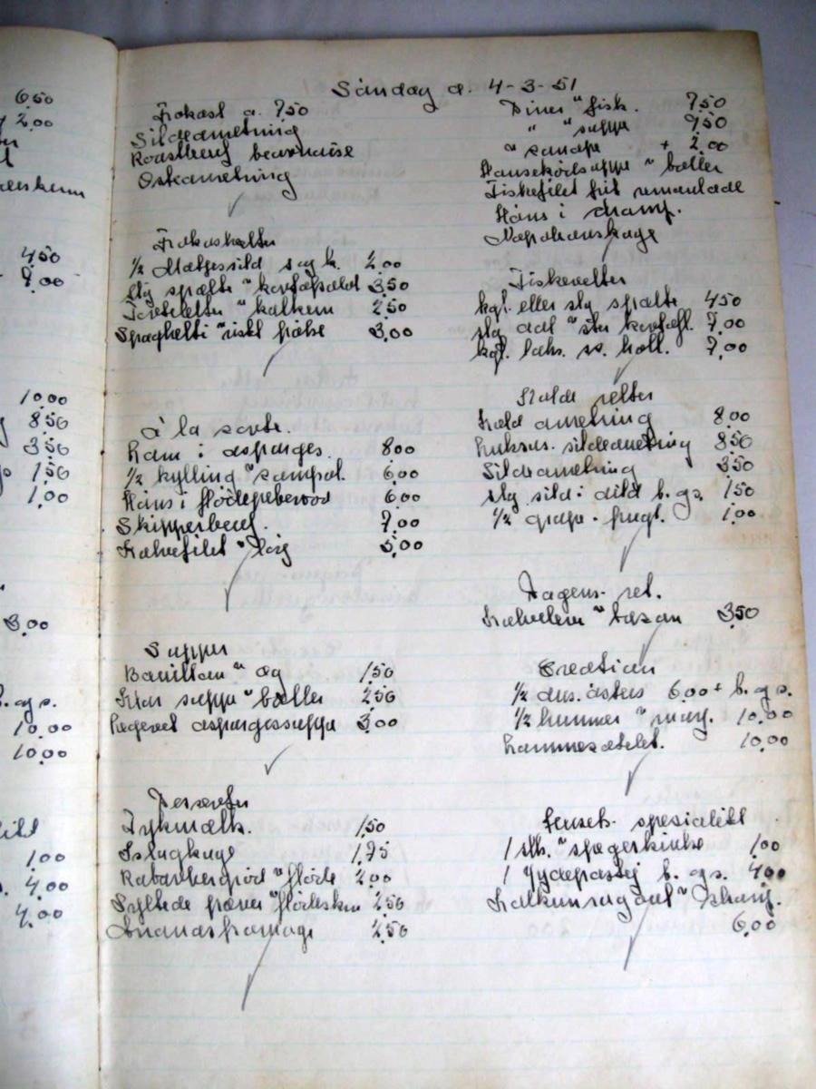 Menubog, Hotel Astoria, København. Håndskrevet. Dateret fra den 1.3.1951 - 6.8.1951. Med alle menuer i perioden og priser. Incl. indlagt menukort fra lørdag den 4.5.1940