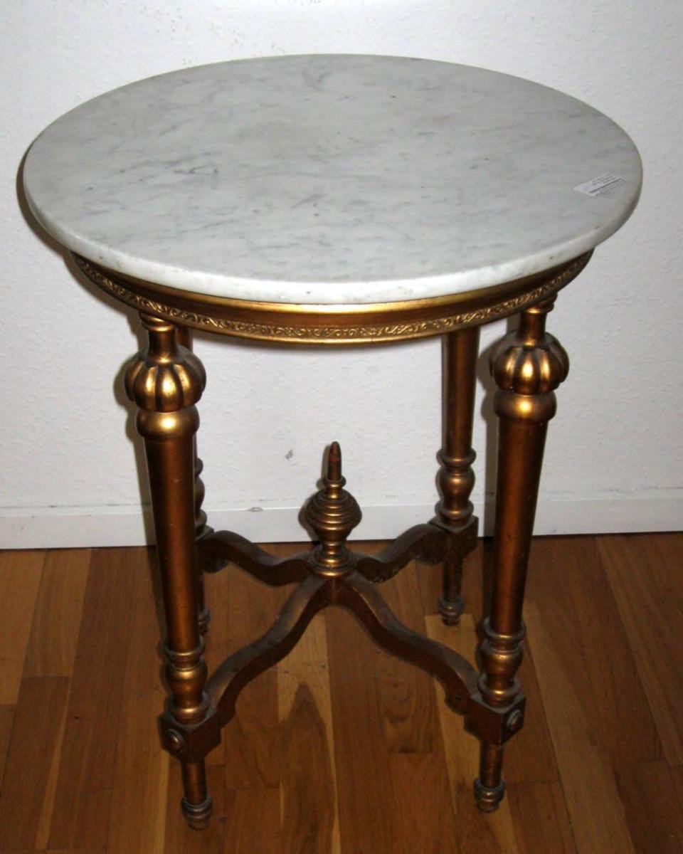 Fransk forgyldt bord med lys marmorplade, 19. årh. Drejede ben med dekoratiner. Kantdekoration. H.: 72 cm. Dia. plade.: 58 cm.