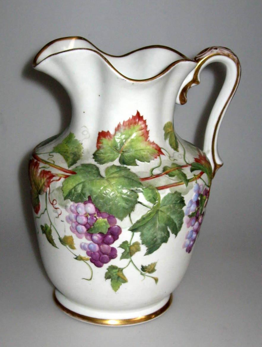 Bing & Grøndahl kande i relief, 19. årh. Støbt porcelæn. Hånd bemalet vinløv i flere farver. Med forgyldte kanter. Signeret.: B&G. H.: 22 cm.