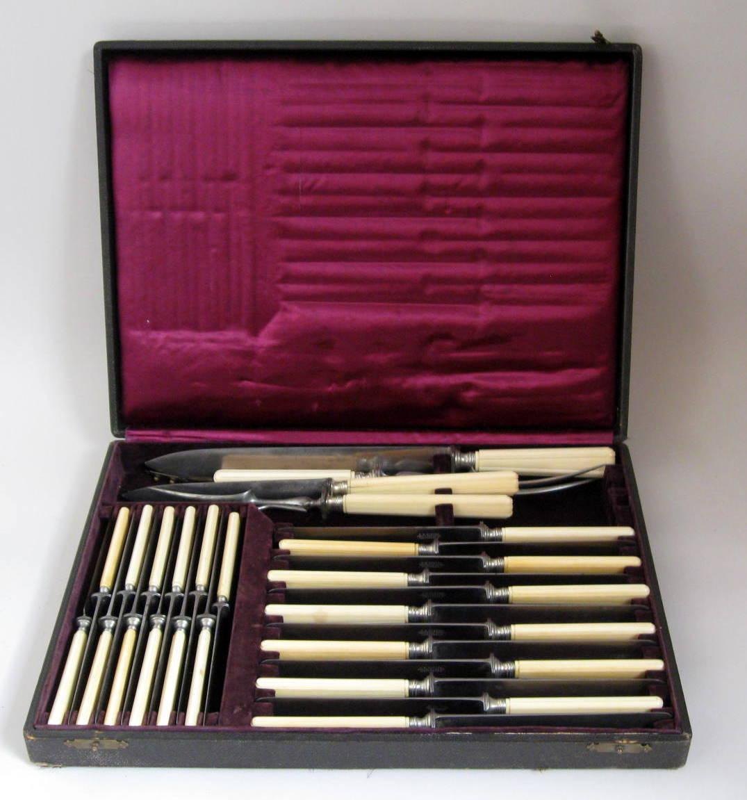 Knivsæt, ca. 1900, Holland. I tilhørende æske, bestående af 12 middagsknive og 12 frokostknive, dertil 2 forskærersæt. Knive signeret: T.F Bastet, Amsterdam.