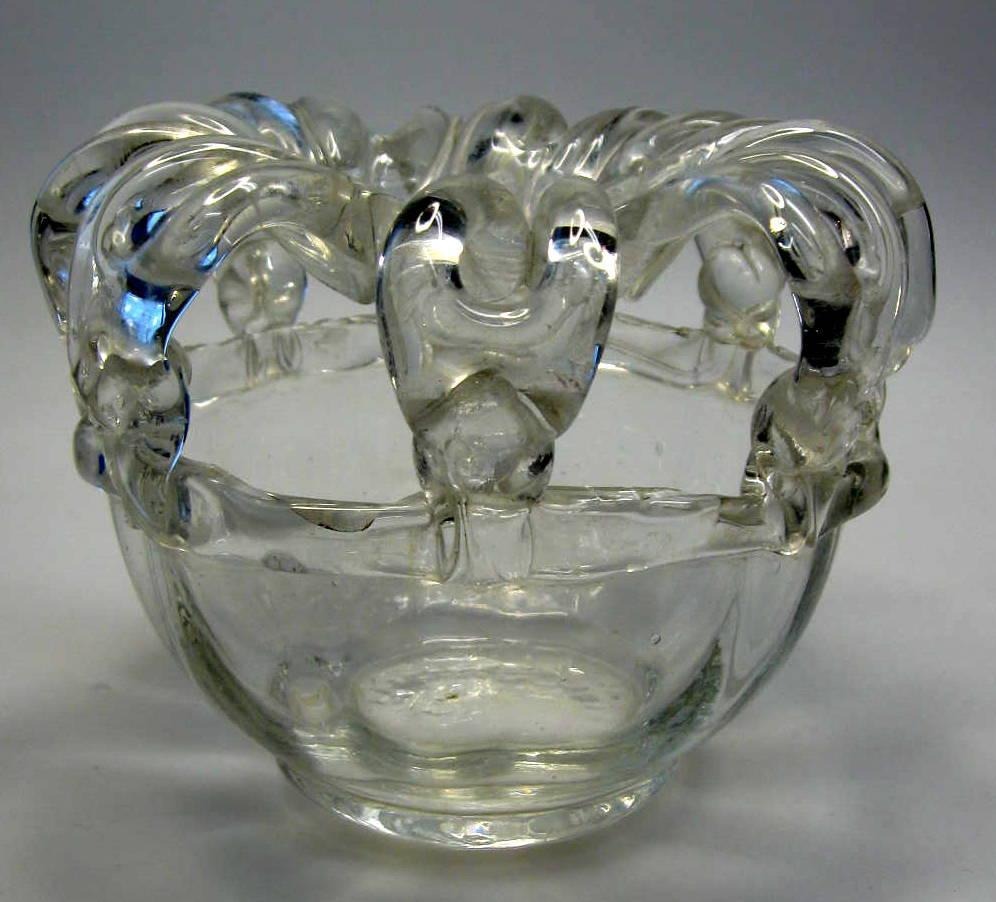 Brudekrone i glas, ca.1900, Danmark. Stor. H.: 12 cm. Dia.: 16 cm. Optisk drevet. Med sårrand i bunden. Proveniens.: Aarhusiansk familie. Antagelig glasfusk fra Aarhus Glasværk.