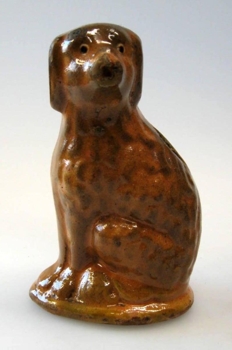 Sparebøsse i ler, Bornhom, 19. årh. I form af en siddende hund. Gulbrun glasur. Med revner - efter forsøg på åbning. H.: 13 cm.